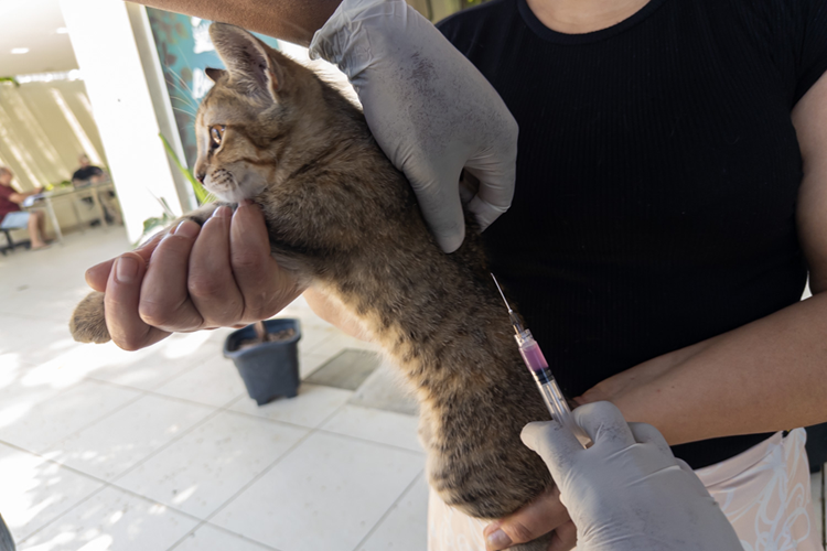 A gatinha Mia, de apenas quatro meses, foi a primeira a receber a dose da vacina antirrábica na manhã desta segunda-feira (3), durante a abertura da campanha de vacinação promovida pela Casa do Servidor. A iniciativa é resultado da parceria entre a Secretaria Municipal de Gestão de Pessoas e a Gerência de Vigilância Ambiental, vinculada à Secretaria Executiva de Atenção Básica.